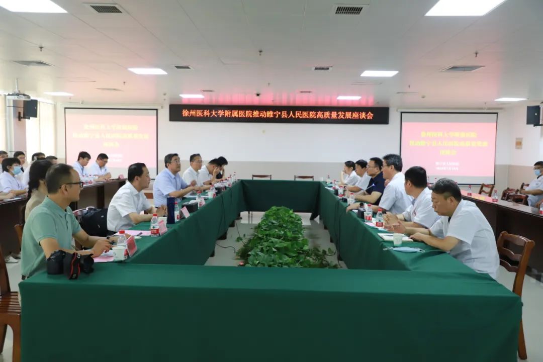 徐州医科大学附属医院联合我院召开医院高质量协同发展座谈会为有效提高我院整体医疗水平、服务能力及综合管理能力,推动医院高质量发展。7月17日上午,徐州医科大学副校长、徐医附院党委书记王人颢、院长金培生带领医院相关部门负责人来我院联合召开医院高质量协同发展座谈会。我院全体班子成员,徐医附院驻睢专家、我院全体职能部门正副职参加会议。座谈会由徐医附院副院长、我院院长燕宪亮主持。
