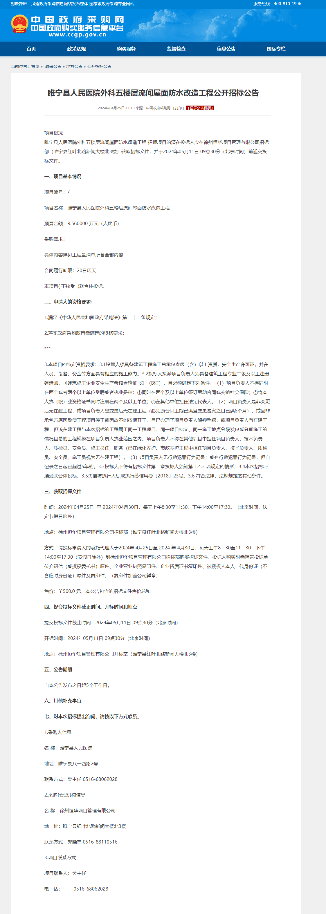 睢宁县人民医院感染性疾病防治综合楼建设项目一期装修工程招标公告