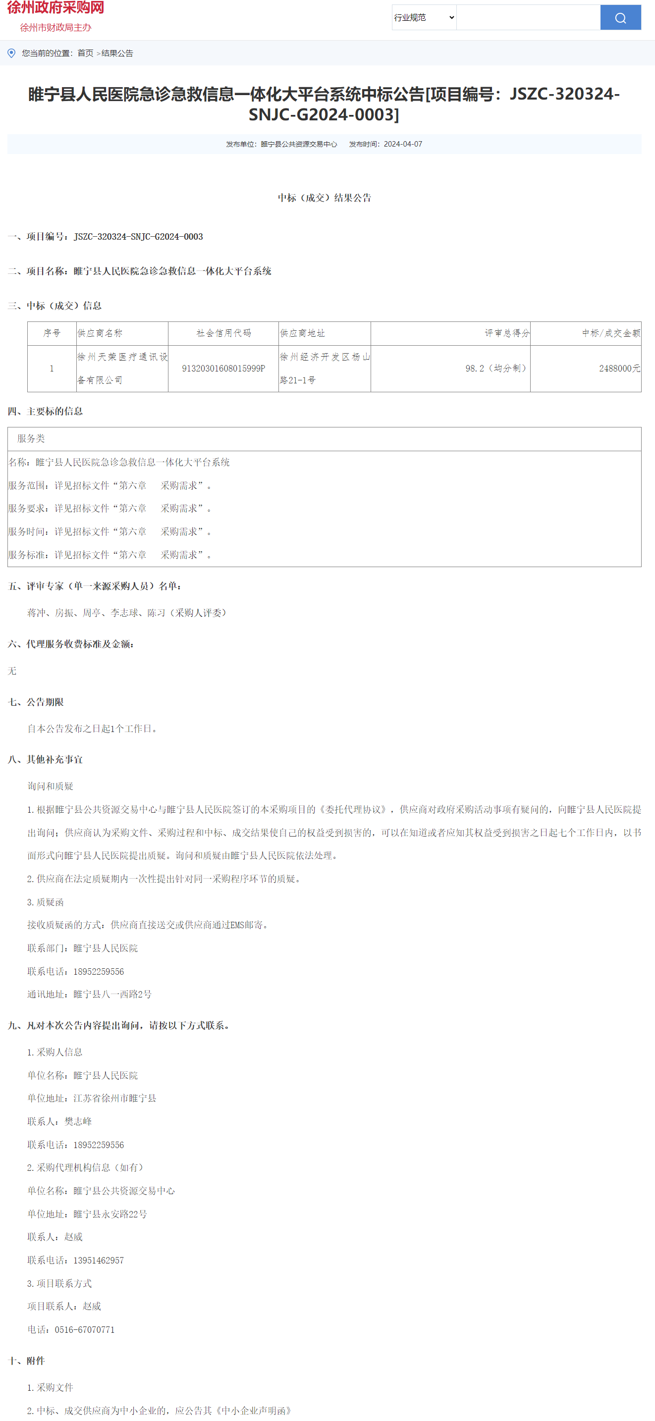 睢宁县人民医院急诊急救信息一体化大平台系统中标公告