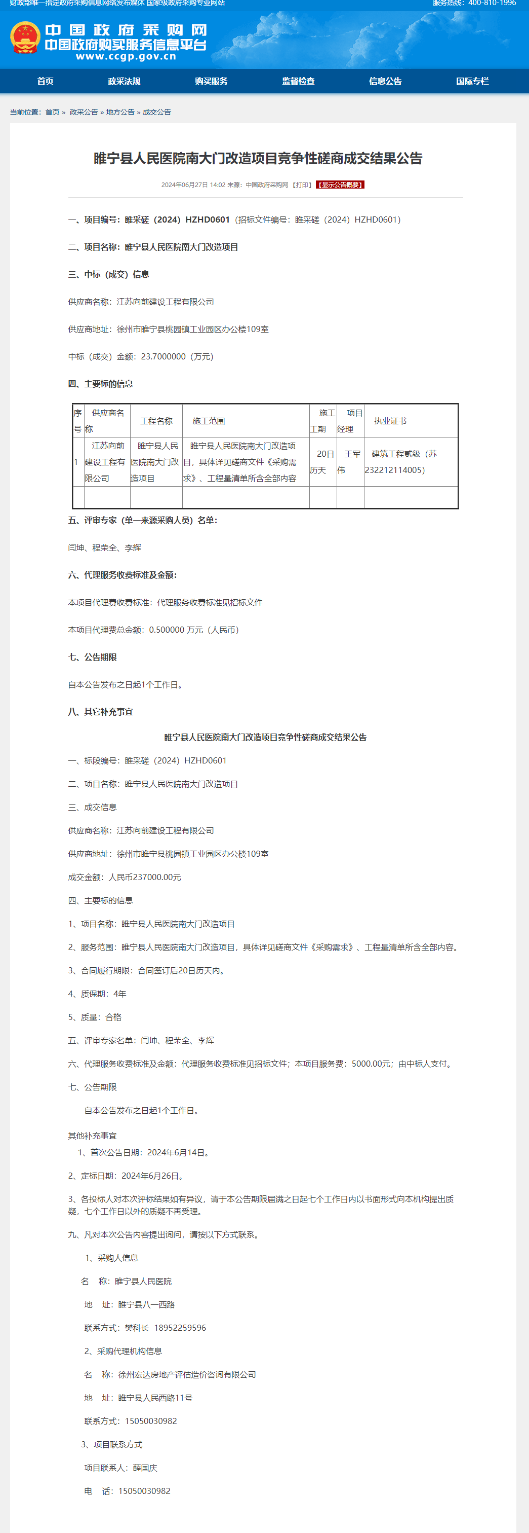 睢宁县人民医院感染性疾病防治综合楼建设项目一期装修工程中标结果公告