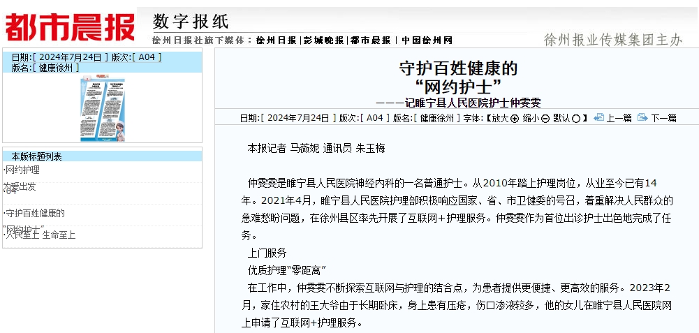 7月24日,都市晨报以《守护百姓健康的“网约护士”》为题,对我院神经内科护士仲雯雯进行了报道。
