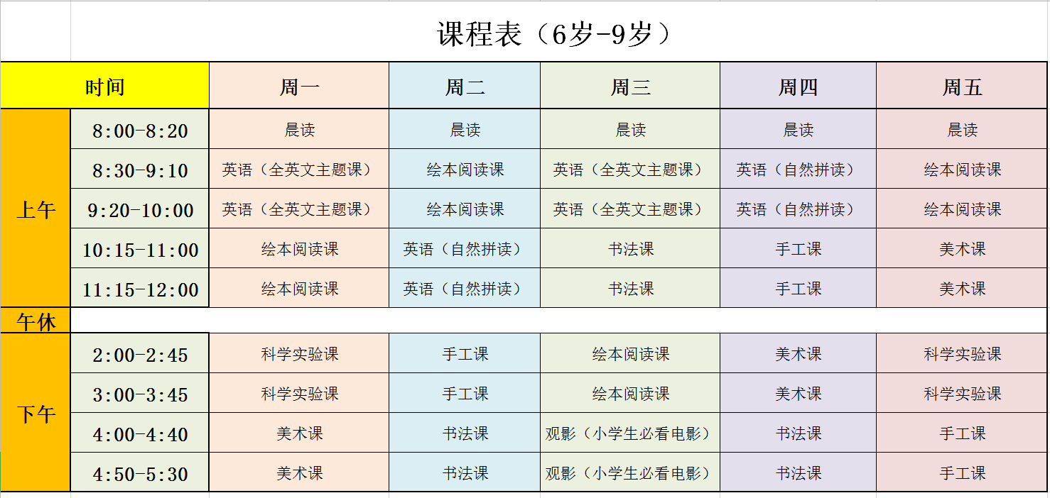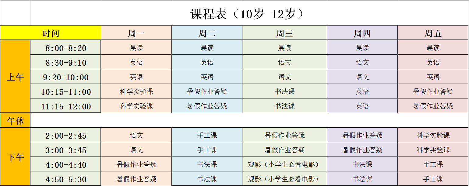 具体课程内容:暑假课程表(6-9岁,每班12人左右;10-12岁,每班10人左右)。