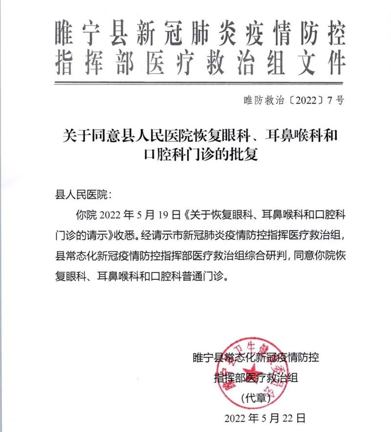 根据睢防救治【2022】7号文件精神,睢宁县人民医院从5月22日恢复眼科、耳鼻喉科普通门诊医疗服务,现将有关事项通知如下: