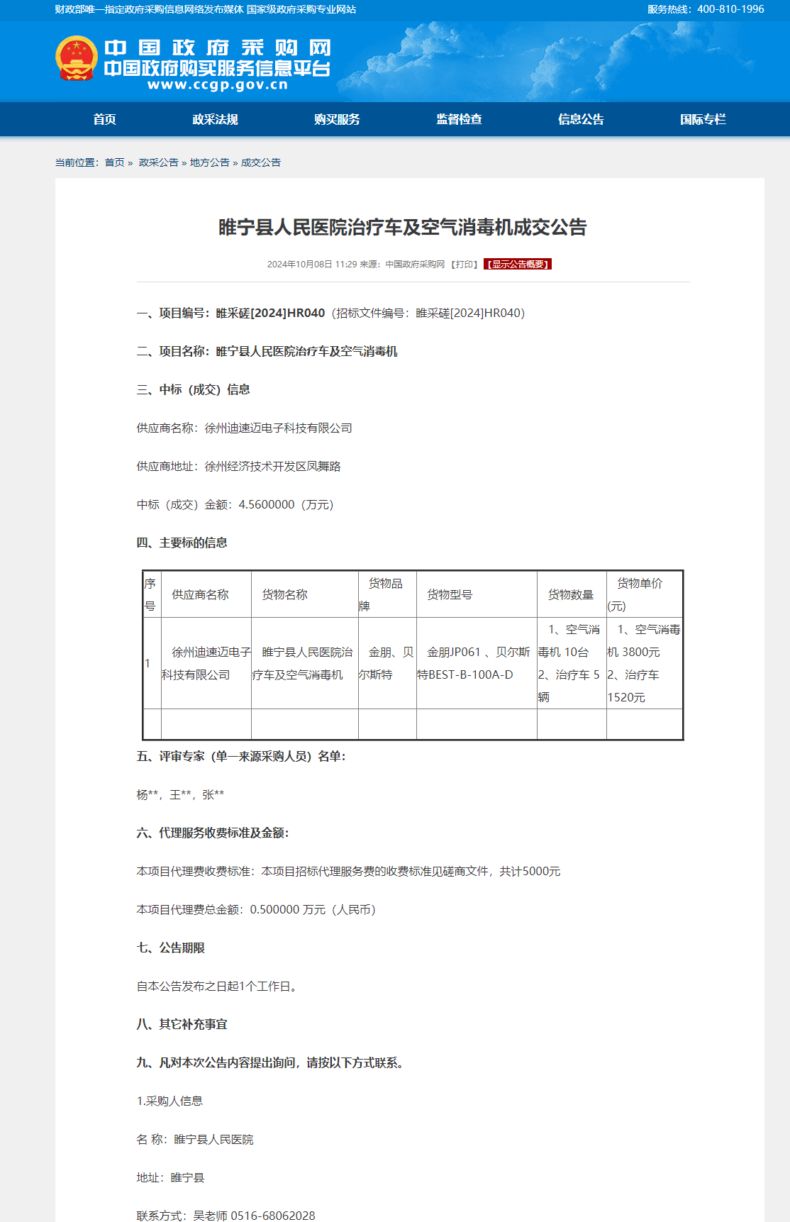 睢宁县人民医院ICU电动床采购及安装成交公告