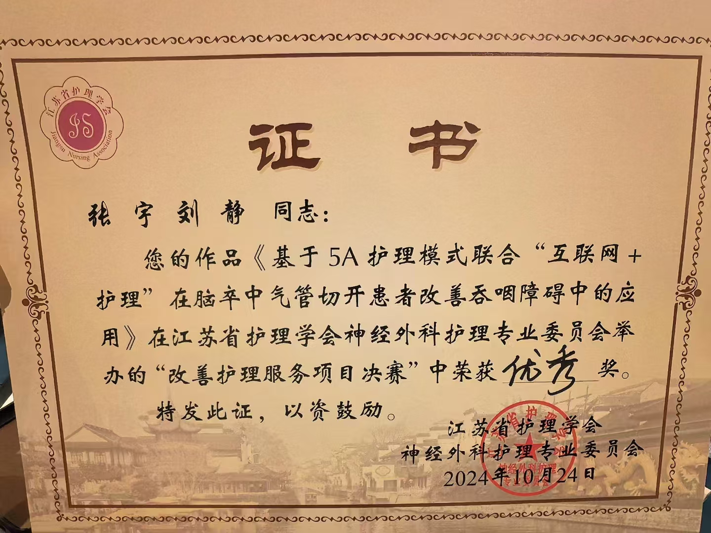 在比赛现场,我院神经外科由张宇、刘静两位护士精心准备的《基于5A护理模式联合“互联网+护理”在脑卒中气管切开患者吞咽障碍改善中的应用》项目脱颖而出,荣获了优秀奖的殊荣。该项目创造性地融合了5A护理模式的全面指导原则与“互联网+护理”的现代科技手段,旨在针对脑卒中气管切开患者的吞咽障碍问题,提供一套既系统又高效的个性化护理解决方案。