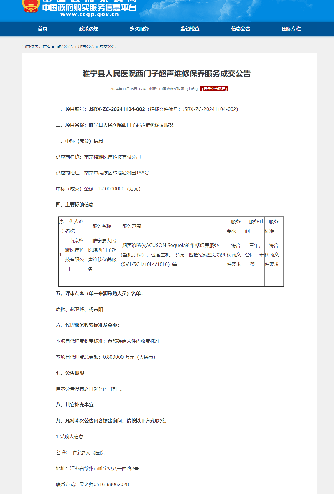 睢宁县人民医院飞利浦超声维修保养服务成交公告