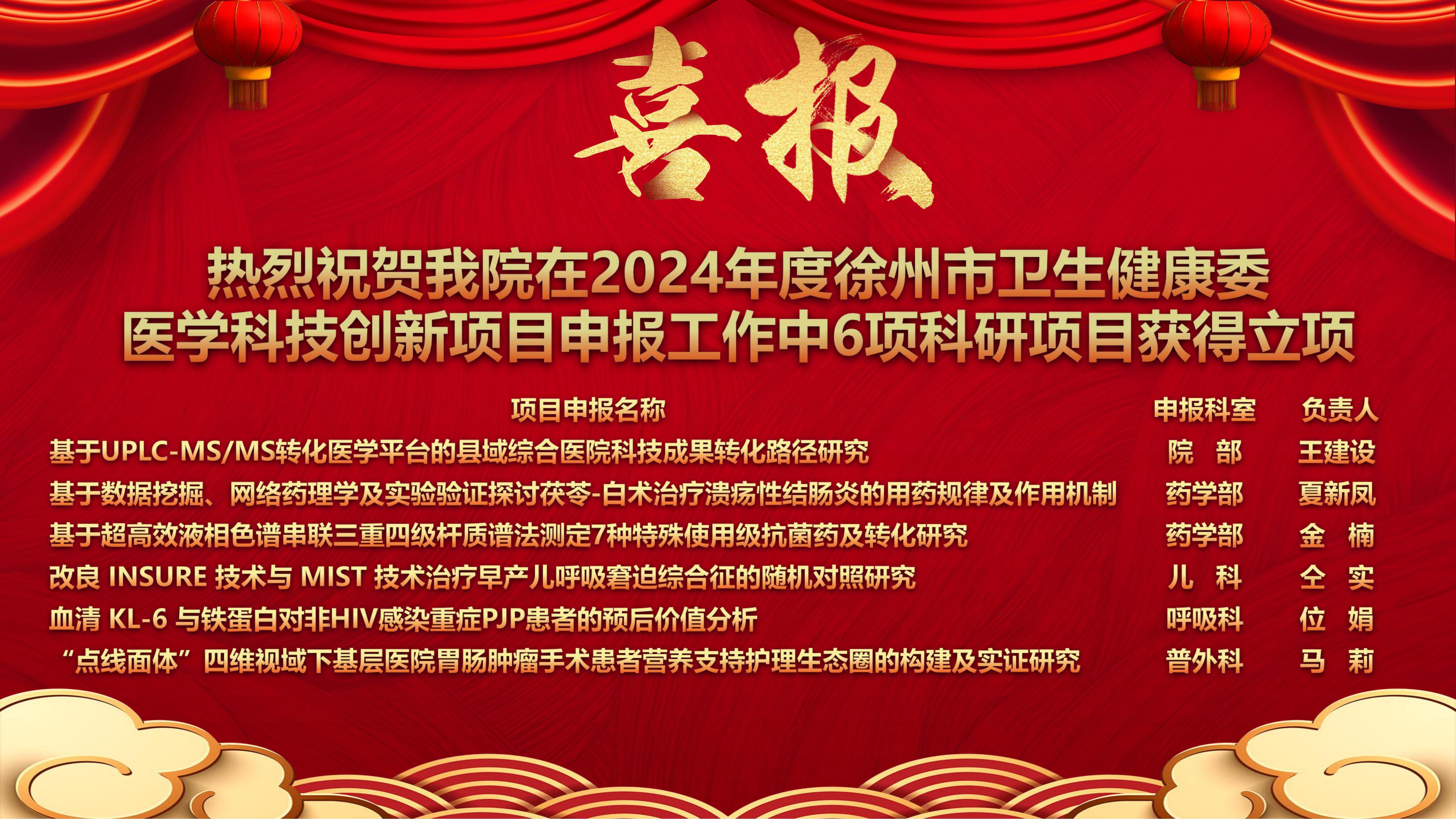此次多项创新项目的立项,是对医院科研实力与团队协作精神的充分肯定。近年来,医院高度重视科研建设工作,大力推行“人才兴院”战略,加快投入药物临床试验机构、中心实验室、图书馆等科研支持平台建设,共培养在职研究生57人,招收博士后人员1人,引进博士人员1人,柔性引进博士人员5人,成功立项各级各类科研课题79项,其中国家级课题1项、省级14项、市级30项,IIT项目3项。荣获各类科研成果奖项18项,其中淮海科技奖一等奖2项、二等奖1项,徐州市新技术引进奖一等奖1项、二等奖1项、三等奖2项,江苏省妇幼保健新技术引进奖二等奖1项,徐州市发明协会科技一等奖1项,省医院协会优秀论文奖2项,徐州市优秀论文三等奖2项等。发表核心及以上论文69篇,其中SCI论文29篇(单篇影响因子突破31.6分),中华系列期刊8篇,授权专利16项,参编专著18部。同步实现了院内高层次人才培养和临床 研究的新突破。