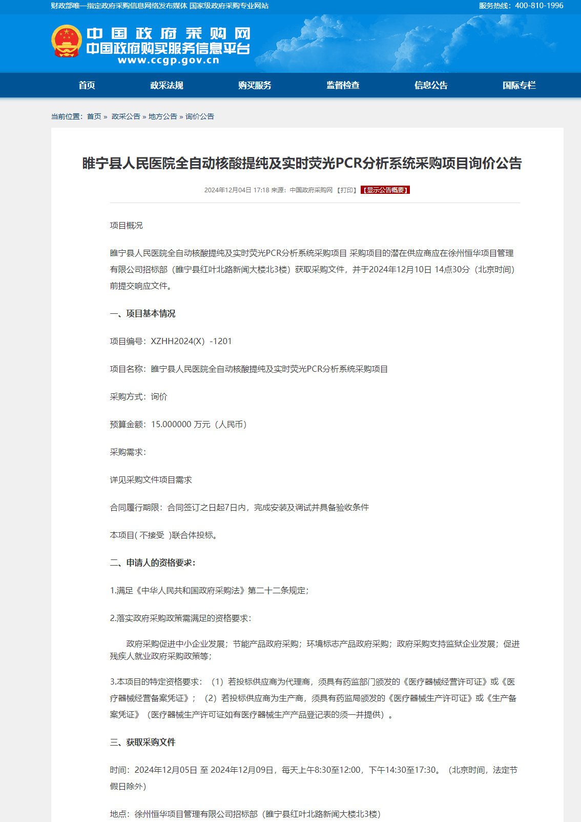 睢宁县人民医院全自动化学发光免疫分析仪(真菌检测)采购项目询价公告