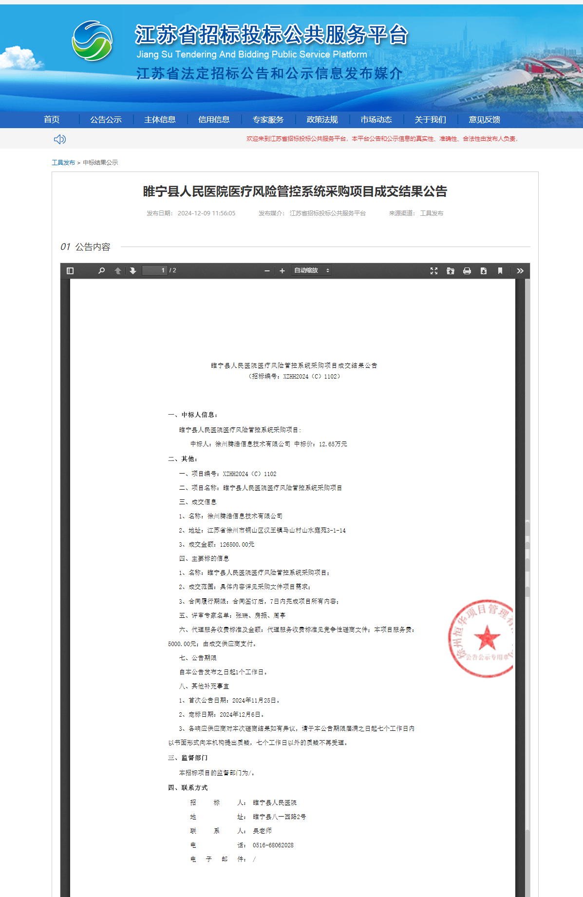 睢宁县人民医院医疗风险管控系统采购项目成交结果公告
