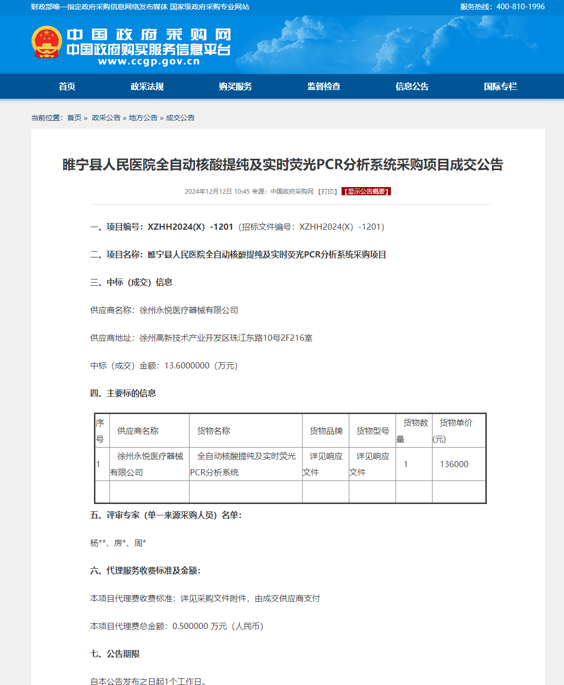 睢宁县人民医院全自动化学发光免疫分析仪(真菌检测)采购项目成交公告