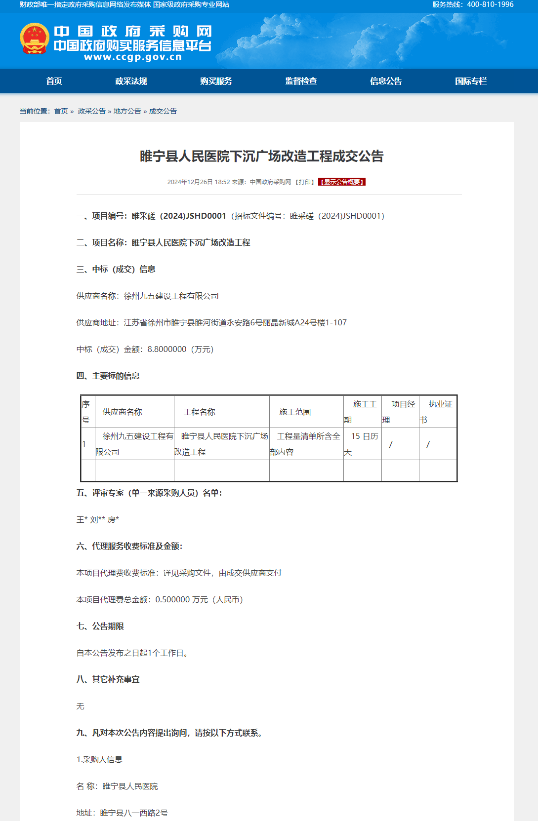 睢宁县人民医院下沉广场改造工程成交公告