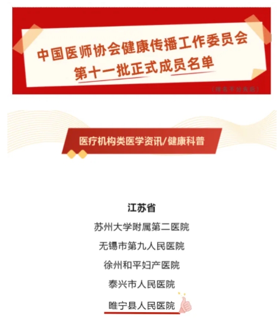 近日,中国医师协会健康传播工作委员会第十一批正式成员名单公布,我院经过线上申报、专家审核、层层严格遴选,正式成为中国医师协会健康传播工作委员会成员单位。
