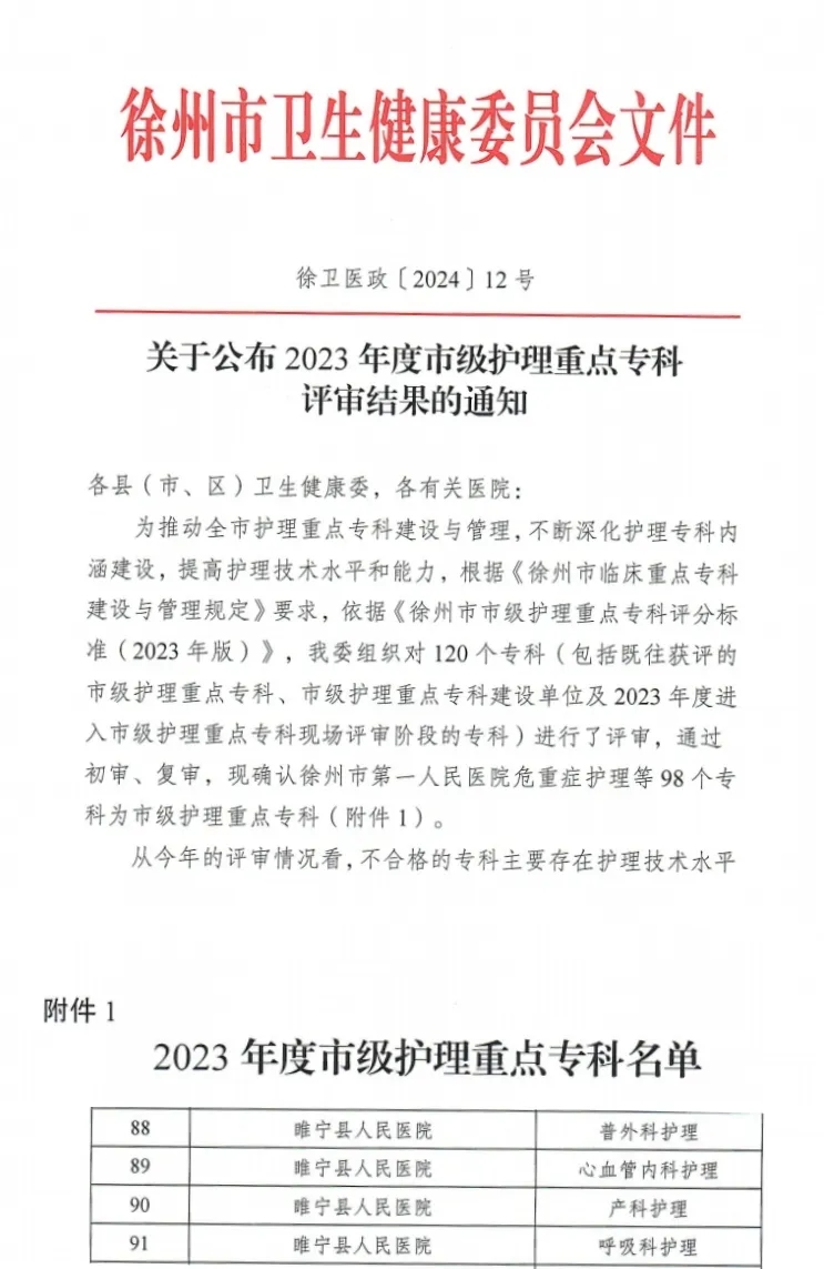 4月11日,徐州市卫生健康委公布了2023年度市级护理重点专科评审结果,我院普外科护理、心血管内科护理、产科护理、呼吸科护理共4个护理专科顺利通过新一轮评审,被确认为市级护理重点专科。在此次评审工作中,我院共计四个护理专科参评,复审全部通过。在徐州市县片区范围内,参评科室数量及通过率均是第一。