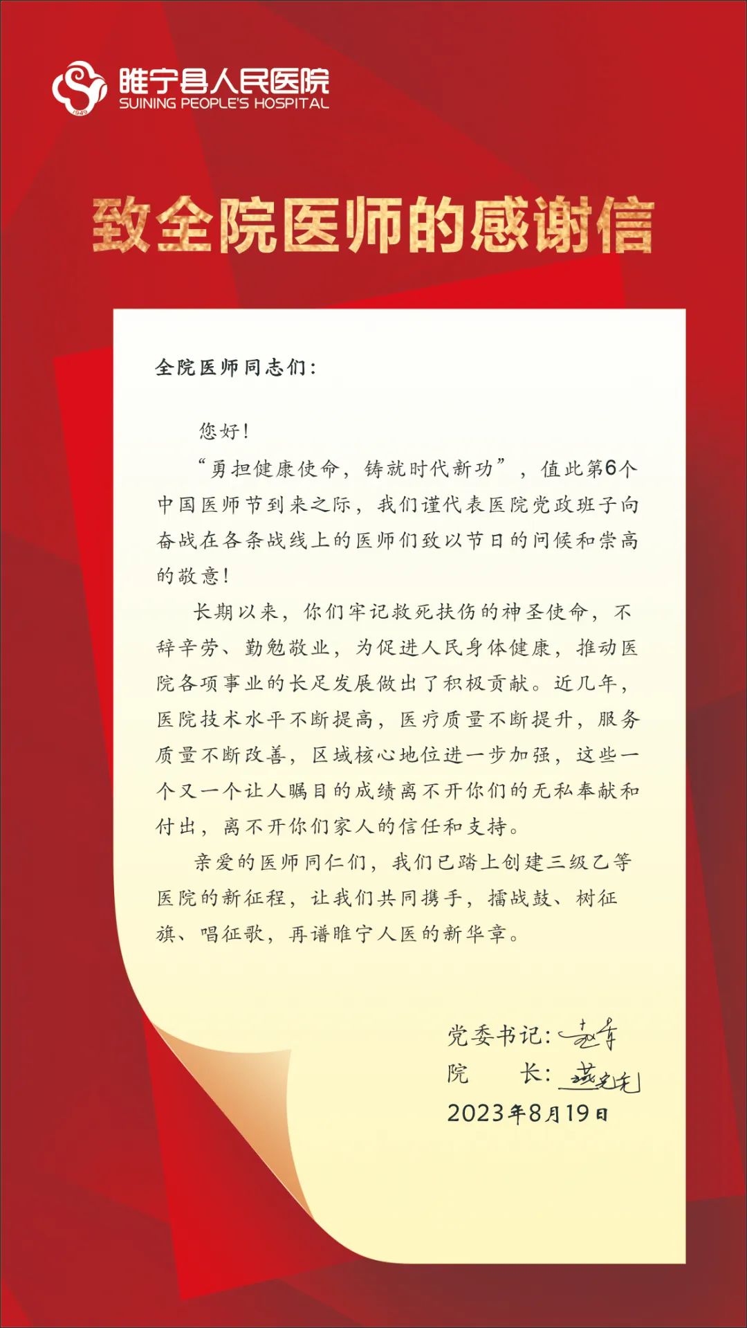 他表示,医院的高质量发展,离不开全院医师们的共同努力。希望全院医师坚决贯彻党的二十大精神,把个人的人生价值与医院的高质量发展紧密结合在一起,勇担健康使命,铸就时代新功。