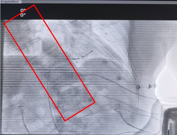 由于此次手术需经下腔静脉抵达心脏,但金先生不仅存在鸡胸合并驼背的情况,还伴有脊柱侧弯变形,致使心脏位置发生明显移位。这使得手术导管要通过下腔静脉进入心脏面临着超乎想象的困难。术中,导丝在通过畸形血管时,甚至都被挤压变形,情况一度十分棘手。
