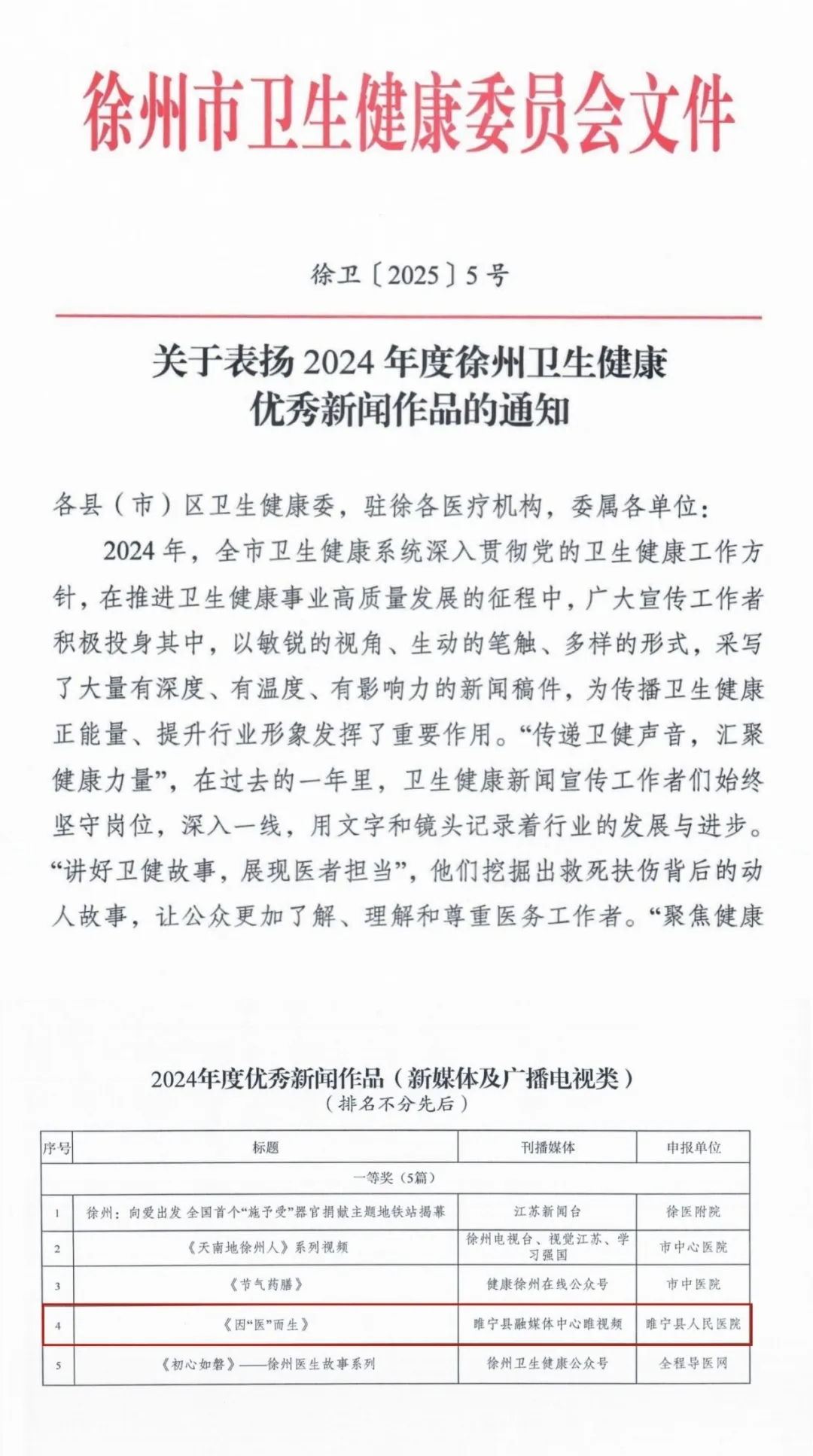 近日,徐州市卫健委下发《关于表扬2024年度徐州卫生健康优秀新闻作品的通知》,其中,我院参评作品《因“医”而生》荣获新媒体及广播电视类一等奖!