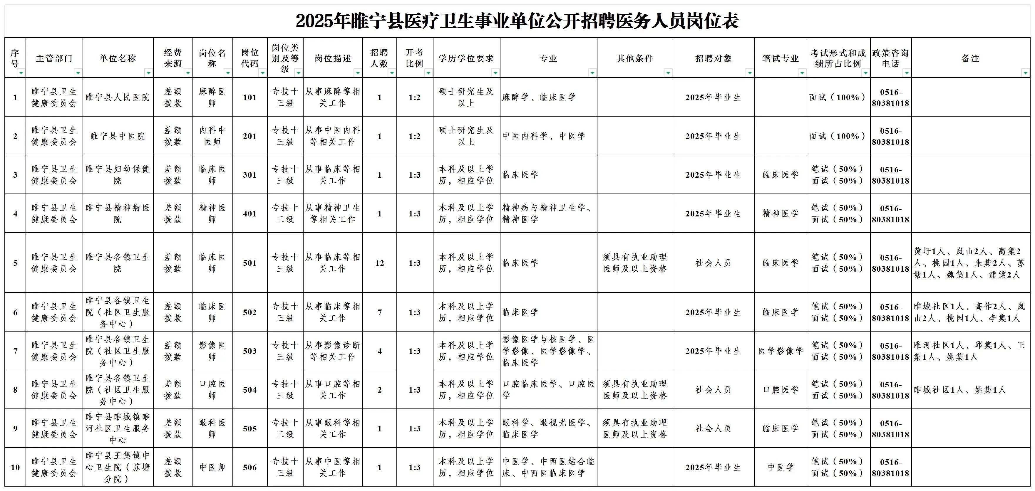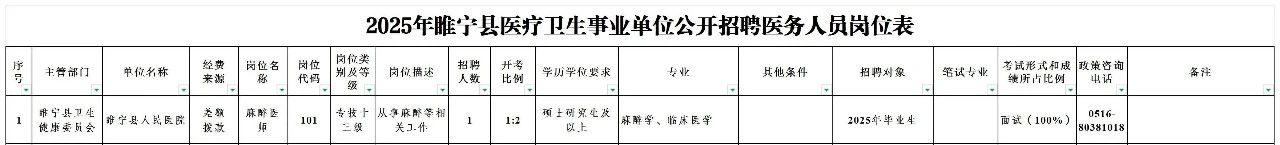 《2025年睢宁县医疗卫生事业单位公开招聘医务人员公告》在徐州市人力资源和社会保障局网站(http://hrss.xz.gov.cn)、睢宁县人民政府官网(http://www.cnsn.gov.cn)和“健康睢宁”微信公众号发布,具体的岗位名称、招聘人数、资格条件等详见《2025年睢宁县医疗卫生事业单位公开招聘医务人员岗位表》(附件1,以下简称《岗位表》)。