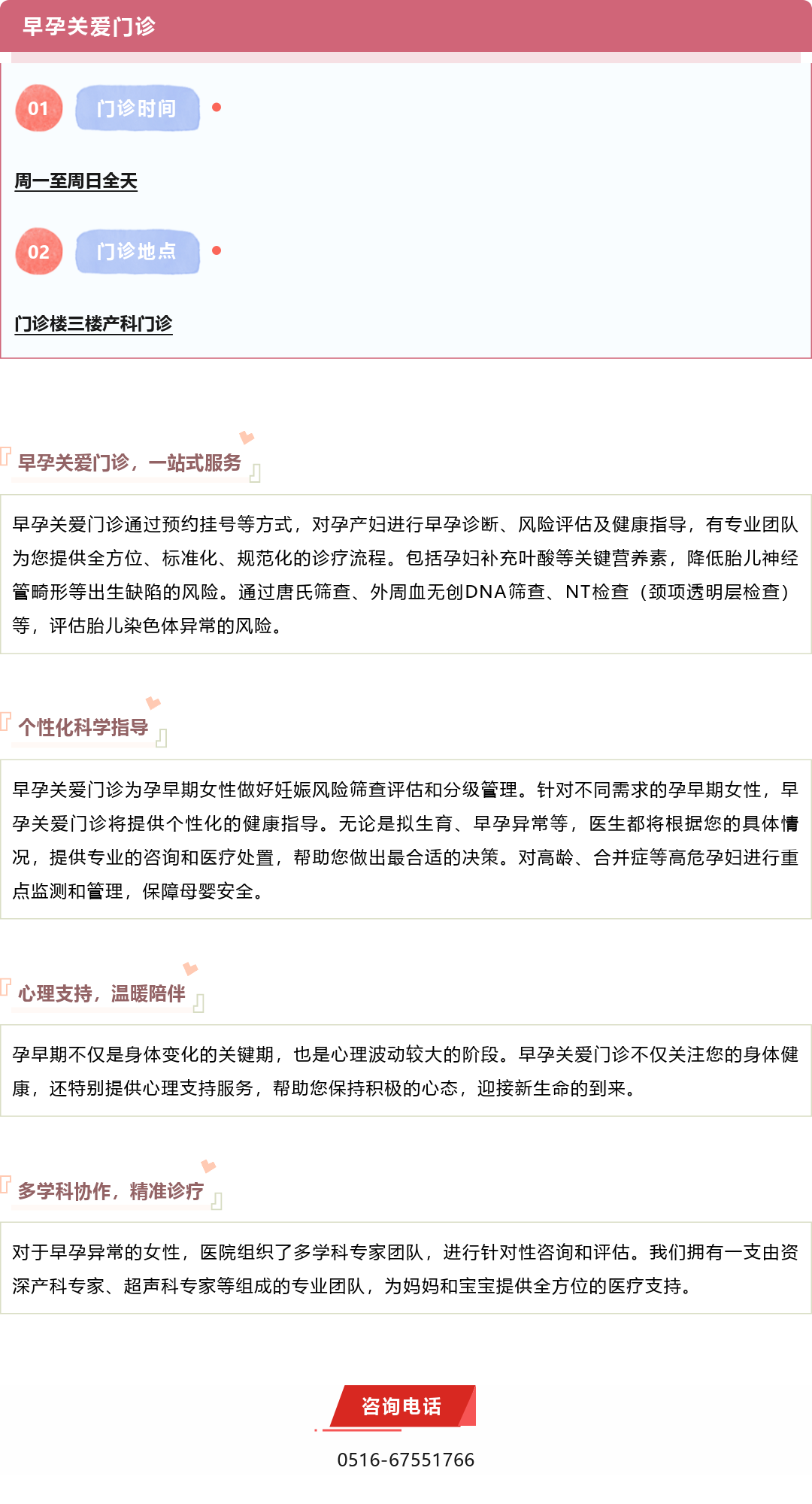 为进一步提升孕产妇健康管理水平,全面落实"服务提升年"工作要求,满足早孕女性对专业医疗服务的需求,睢宁县人民医院特别推出”早孕关爱门诊”。从初次确认怀孕的那一刻起,我们便全程陪伴,你所关心的、关注的,我们都能为您提供专业解答,细心呵护您和宝宝的健康!