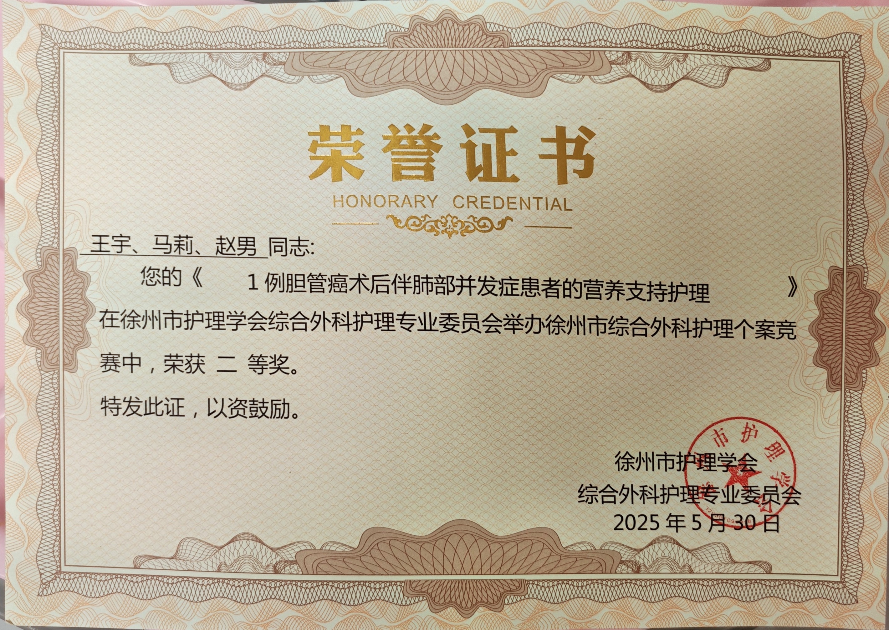 为进一步提升徐州市综合外科护理专科建设,推广先进护理实践经验,激发护理人员创新思维,近日,由徐州市护理学会综合外科护理专业委员会主办的 “优秀护理个案竞赛” 圆满落幕。睢宁县人民医院护理团队王宇、马莉、赵男三人组成的参赛小组,凭借《“负氮平衡” 到 “营养 - 呼吸双修复”——1例胆管癌术后伴肺部并发症患者护理》案例,从全市众多参赛作品中脱颖而出,荣获二等奖。