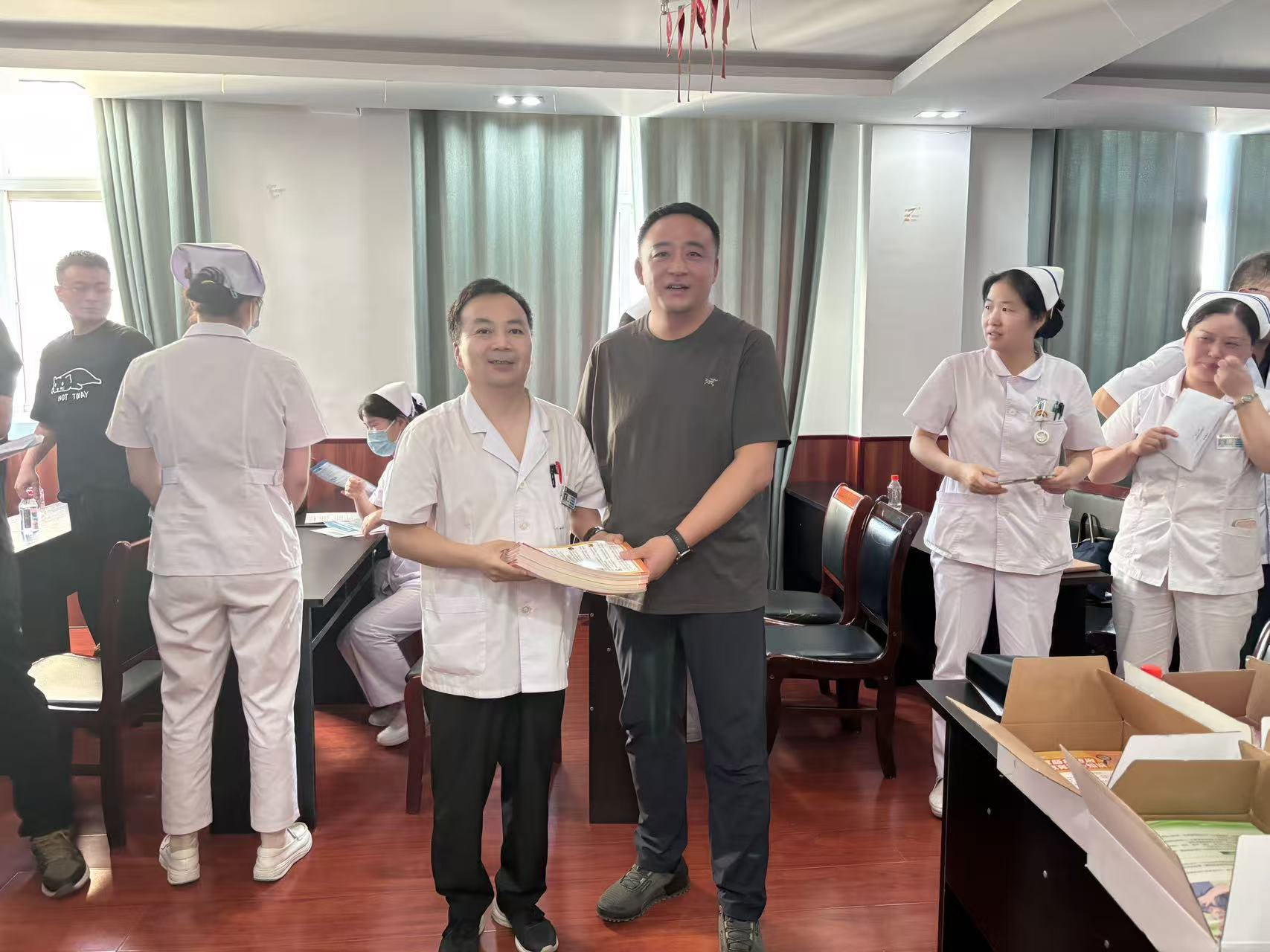 为营造 “科学防癌,健康生活” 的社会氛围,推进会现场举行了科普资料发放仪式。我院副院长朱国辉向医共体成员单位代表发放《癌症防治核心知识手册》《常见癌症早期信号图解》等科普资料。资料内容科学通俗、图文并茂,涵盖癌症预防核心知识、早期预警信号识别、健康生活方式倡导及 “三早” 理念宣传,将由各成员单位分发至辖区村卫生室、社区站点及居民手中,进一步扩大健康教育覆盖面与影响力,让科学防癌理念深入人心。