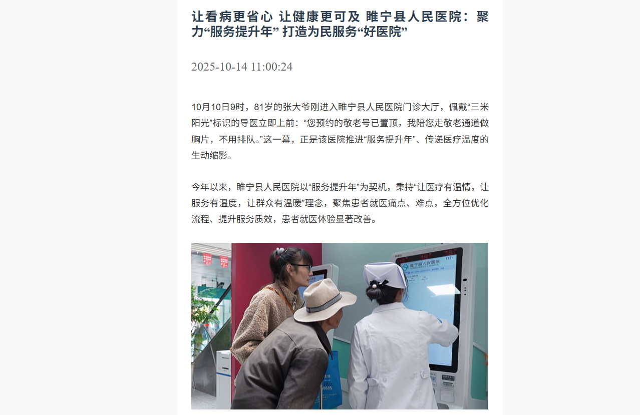医疗服务提升没有终点,下一步,该院将把便民举措、智慧服务、人文关怀固化为长效机制,持续优化就医流程、提升服务质量,让每一位患者都能在就医路上感受到安心与温暖,为睢宁百姓的健康筑起坚实屏障。