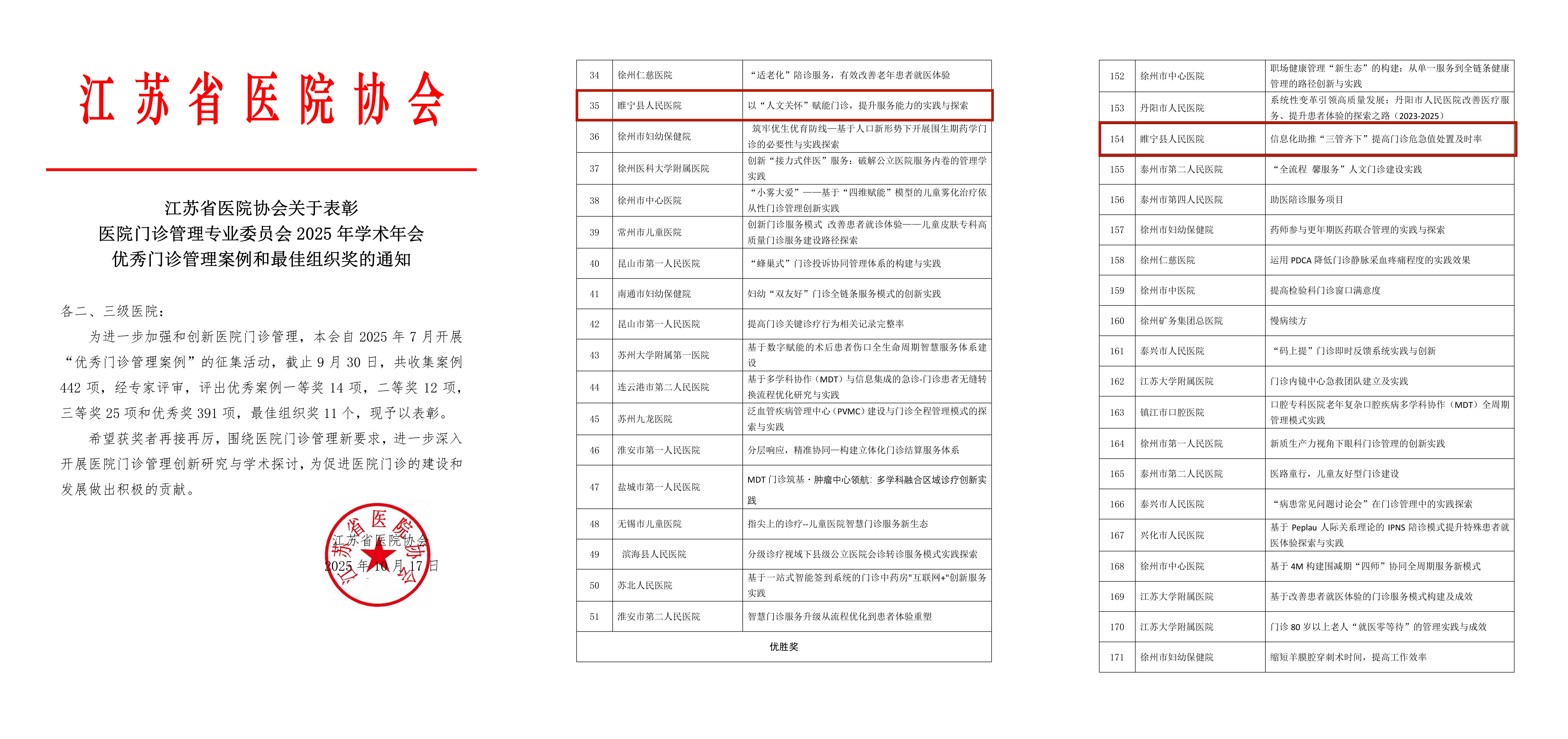 近日,江苏省医院协会门诊管理专业委员会2025年学术年会优秀管理案例评比结果正式揭晓。我院门诊部团队凭借在门诊服务改革领域的持续深耕与创新实践,一举斩获两项重要荣誉 —— 门诊部孙桂梅申报的《“人文关怀” 赋能门诊,提升服务能力的实践与探索》案例荣获三等奖,韩梅申报的《信息化助推 “三管齐下”,提高门诊危急值处置及时率》案例荣获优胜奖。这不仅是省级专业平台对我院门诊管理创新能力的高度认可,更为医院高质量发展注入了强劲动力,充分彰显了我院在门诊精细化管理、智慧医疗服务与人文关怀融合发展等方面的综合实力。