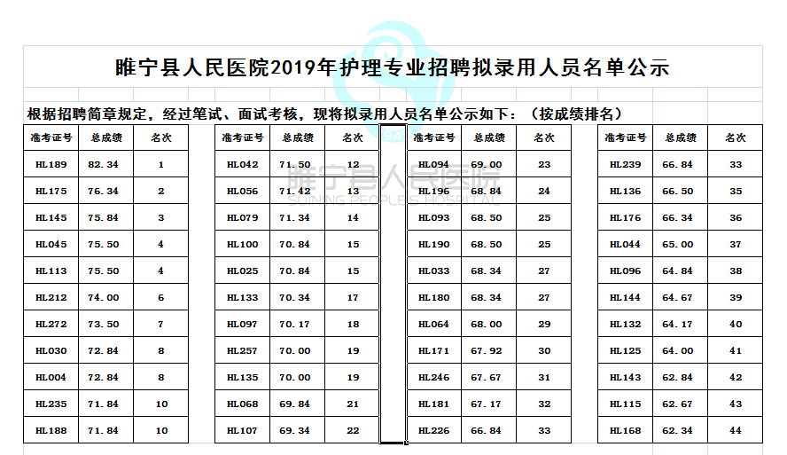 睢宁县人民医院2019年卫生专业技术岗位招聘进入面试人员公示