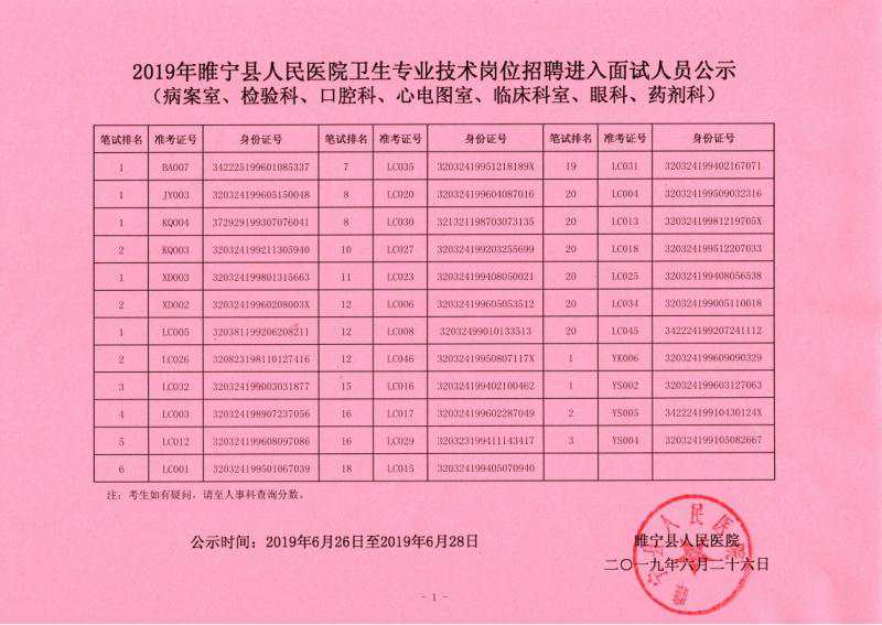 睢宁县人民医院卫生专业技术岗位招聘进入面试人员公示