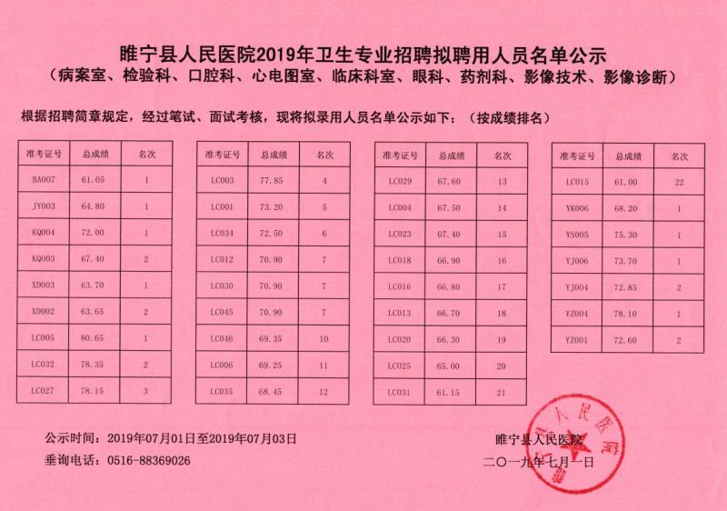 睢宁县人民医院卫生专业技术岗位招聘进入面试人员公示