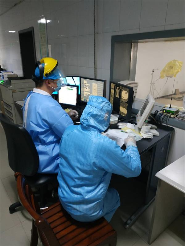 新冠肺炎进入机体后首先侵犯呼吸道粘膜,并较早进入肺组织,胸部CT检查早期即可见双肺外周带斑片影及模玻璃影,病变发展较快,严重的3一5天可侵犯全肺即“白肺”。通过大量新型冠状病毒肺炎病例观察,认为只要流行病学史明确,胸部CT检查阳性率早于核酸阳性,甚至早于临床表现。为确保发热患者尽快拿到最精准的报告,CT室第一时间安排检查,诊断医师最短时间出报告,为准确判断疫情提供了重要依据和坚实基础。在这场重大疫情阻击战中,CT室全体医护人员在疫情面前不退缩,24小时坚守,勇当先锋。
