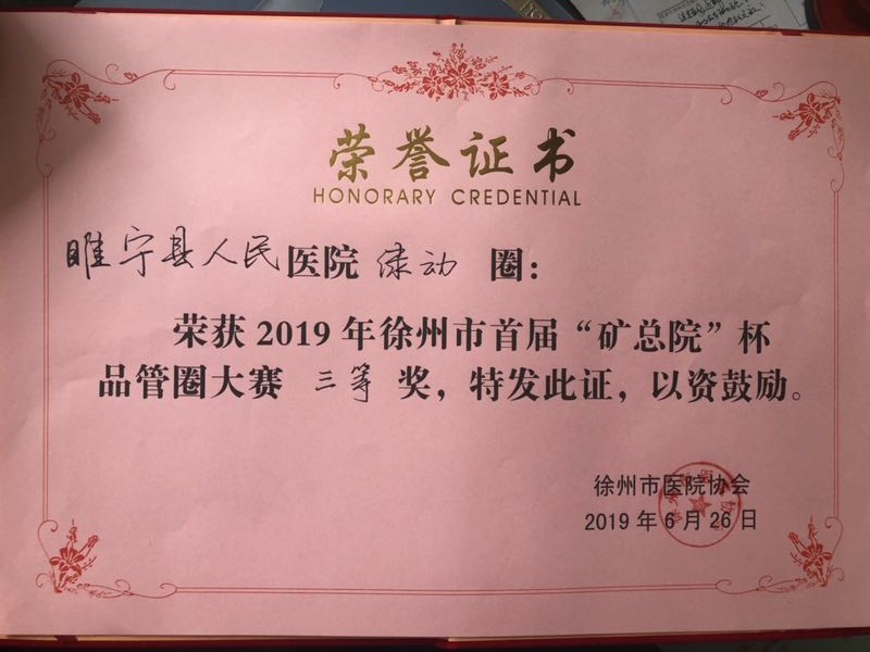这次“矿总院”杯品管圈大赛由所有徐州市二级以上医院共同参赛。睢宁县人民医院品管圈小组在历经了筛选,预赛,决赛的 各个环节的种种考验后,脱颖而出。最终在22组参赛医院中荣获三等奖,为全县的医疗队伍争光添彩,为全县人民的医疗卫生事业发展做出了榜样。