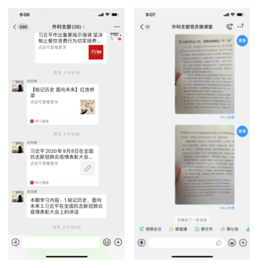 组织支部党员进行“学习强国”平台的学习,并每周在微信群上报学习成绩。利用现有的钉钉软件创建“微课堂、微学习”着力把平台建设成支部党员干部的学习交流平台、党务公开平台、推进医院发展平台,开拓出一条党建工作践行初心、与时俱进之路。利用支部微信群,群里交流心得体会,进行讨论,极大的调动了员工学习的积极性。