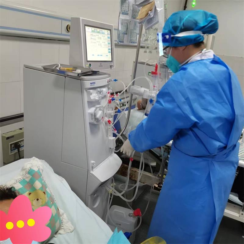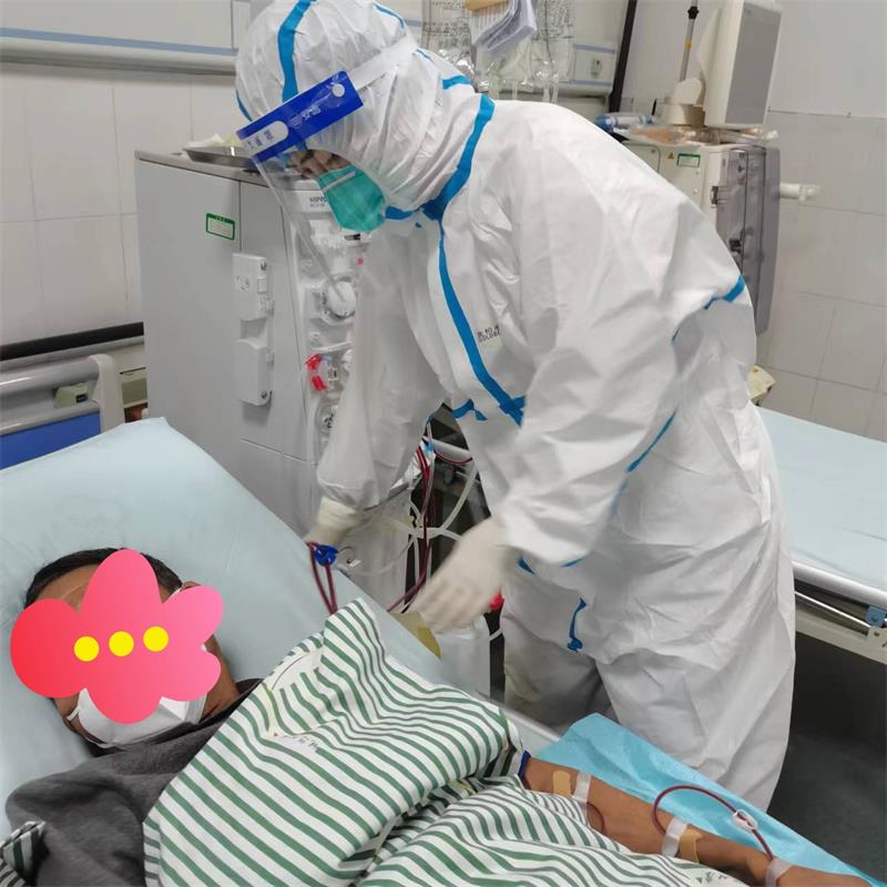 在阳性透析患者数量激增的情况下,科室给阳性病人开了晚班,分开透析,为了保障每一位透析患者每周2~3次规律透析,每天早上七点半,透析室医护人员就开始忙碌的工作,开机、冲管、排气、穿刺、引血、上机、消毒……特殊时期,他们穿着隔离衣,带着N95口罩和面屏,从上机到下机,大约需要5个小时,每天三班,尽管大家回家已至半夜,但他们一刻也不马虎。