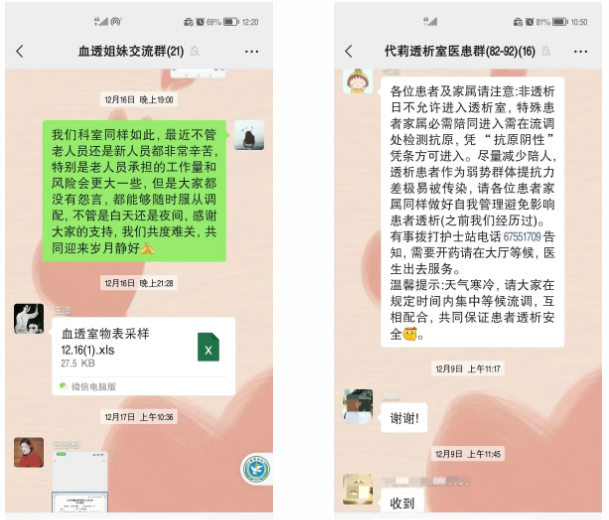 为了保证工作顺利开展,大部分护士都是持续工作10小时以上,不仅需要做好患者透析治疗,还要承担着透析顺序全部打乱的局面。比如某某阳了、某某核酸结果没出来、某某不能夜班透析、某某夜班透析结束无法回家、某某家人联系不上,每天都有诸如此类事情发生。因此,每日每班次都要重新排班,需要反复给患者打电话、微信沟通、再次确认透析时间。