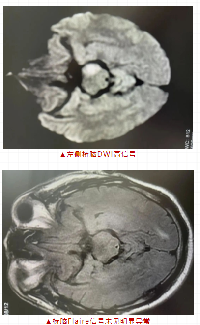 我院迅速开通卒中绿色通道。郁主任紧急联系了援睢专家、徐医附院神经内科陆军主任,陆军主任快速评估病情后紧急联系影像科行急诊头颅磁共振检查。其中头颅MRI+MRA显示:桥脑左侧部分新鲜梗死灶(DWI高信号,Flaire正常),颅内大血管未见闭塞。患者发病原因考虑颅内穿支血管闭塞引起的急性脑梗死,磁共振DWI/Flaire不匹配高度提示患者发病时间在4.5小时之内。