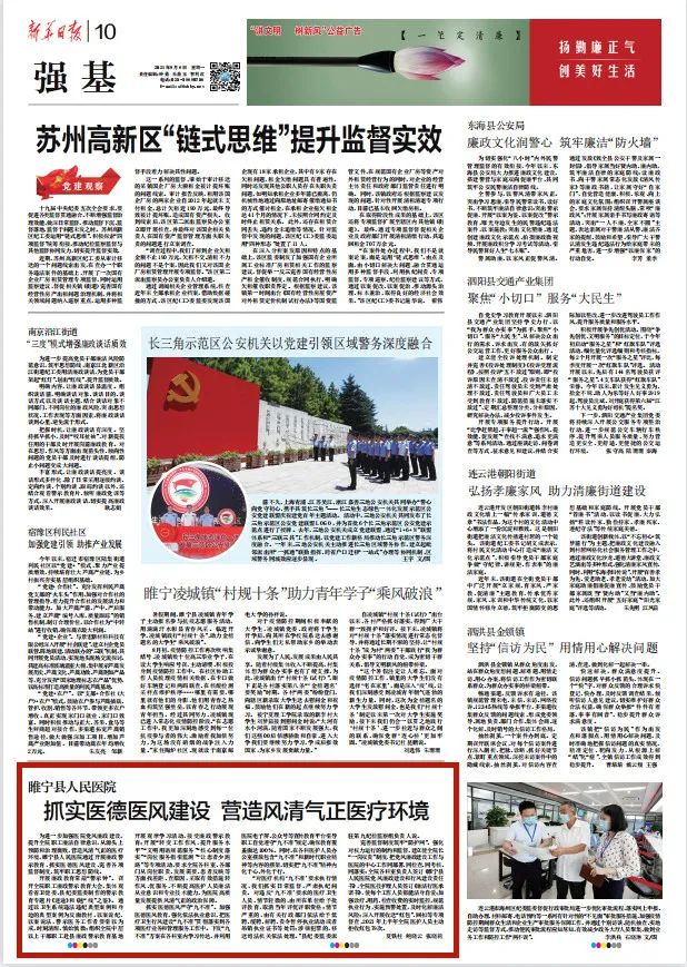 9月6日《新华日报》以“抓实医德医风建设 营造风清气正医疗环境”为题点赞我院行风建设工作。9月8日,”学习强国“平台相继推出,为全国医风建设提供可借鉴可推广的“实战”经验。
