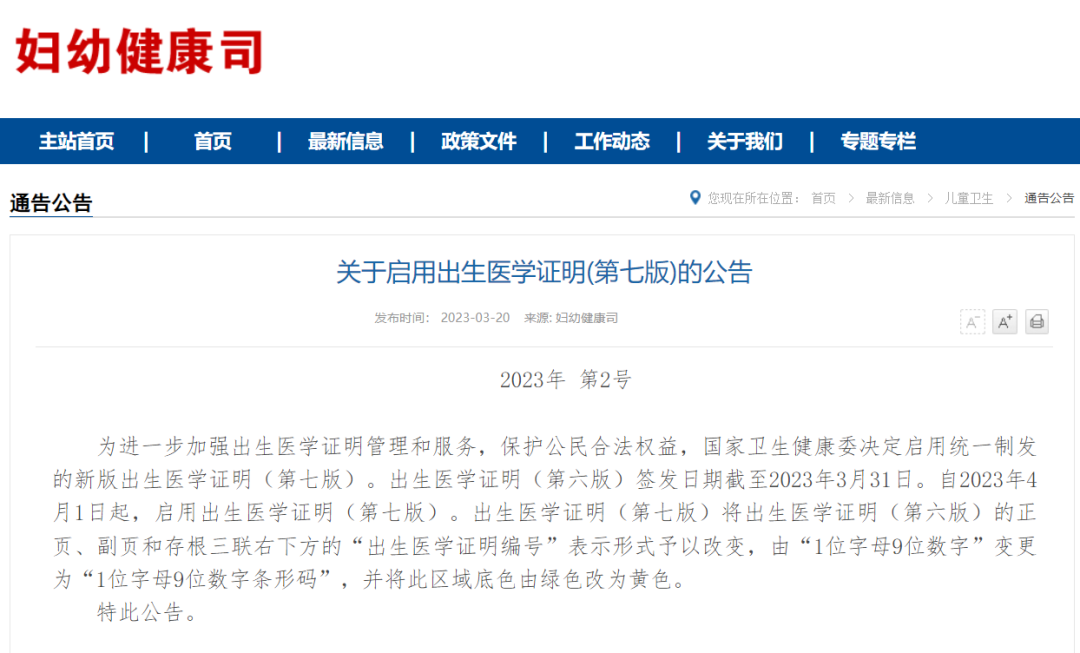 出生医学证明(第七版)将出生医学证明(第六版)的正页、副页和存根三联右下方的“出生医学证明编号”表示形式予以改变,由“1位字母9位数字”变更为“1位字母9位数字条形码”,并将此区域底色由绿色改为黄色。