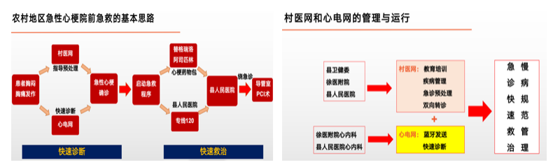而“心肌梗死全流程救治项目”就是以村医网、心电网等信息化手段为支持,完善县、乡、村三级医疗机构的一体化疾病管理新模式,从最源头方面,早期诊断、早期转运、早期用药,对危急重症患者直接送达县医院进行急诊治疗,切实地提高农村心梗患者的存活率,同时患者加强管理,达到全流程救治目的。