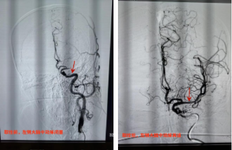 手术台上,卒中中心团队通过微导管及导丝配合,快速而细致地进行着每一步操作。因为每一分钟、每一秒钟对于患者都至关重要,闭塞的血管早开通一秒钟都会多挽救出更多的脑细胞。经过1个多小时的取栓治疗后,抽拉结合一把实现血管再通,堵塞的斑块最终被成功取出,终于可见血流清晰通过。至此,生命的通道被重新开通,患者在手术台上逐渐恢复意识,右侧肢体可自行抬起。