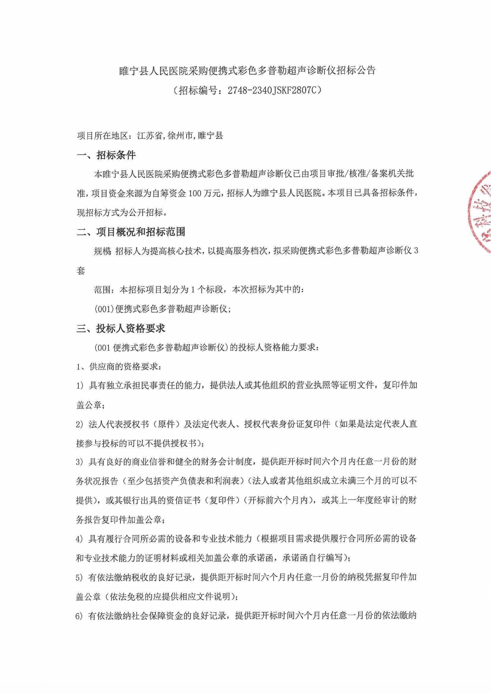 睢宁县人民医院采购便携式彩色多普勒超声诊断仪招标公告