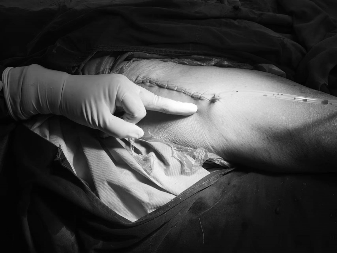 患者家属同意手术方案后,经过充分的术前准备,骨科团队医生们选择前侧入路进行髋关节置换,切口仅有一根手指长度,从肌间隙进入,只需离断一根动脉分支,不会损伤肌肉。