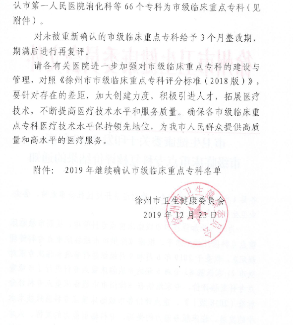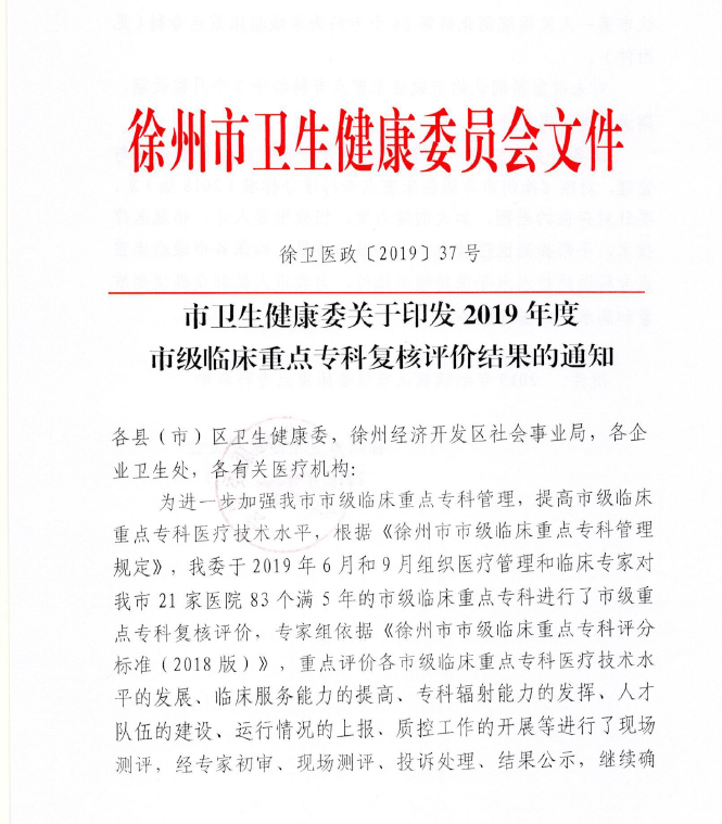 近日徐州市卫健委印发了《市卫生健康委关于2019年度市级临床重点专科复核评价结果的通知》,睢宁县人民医院心血管内科被评定为徐州市市临床医学重点专科,标志着我院在专科建设方面取得新进展、新成绩。