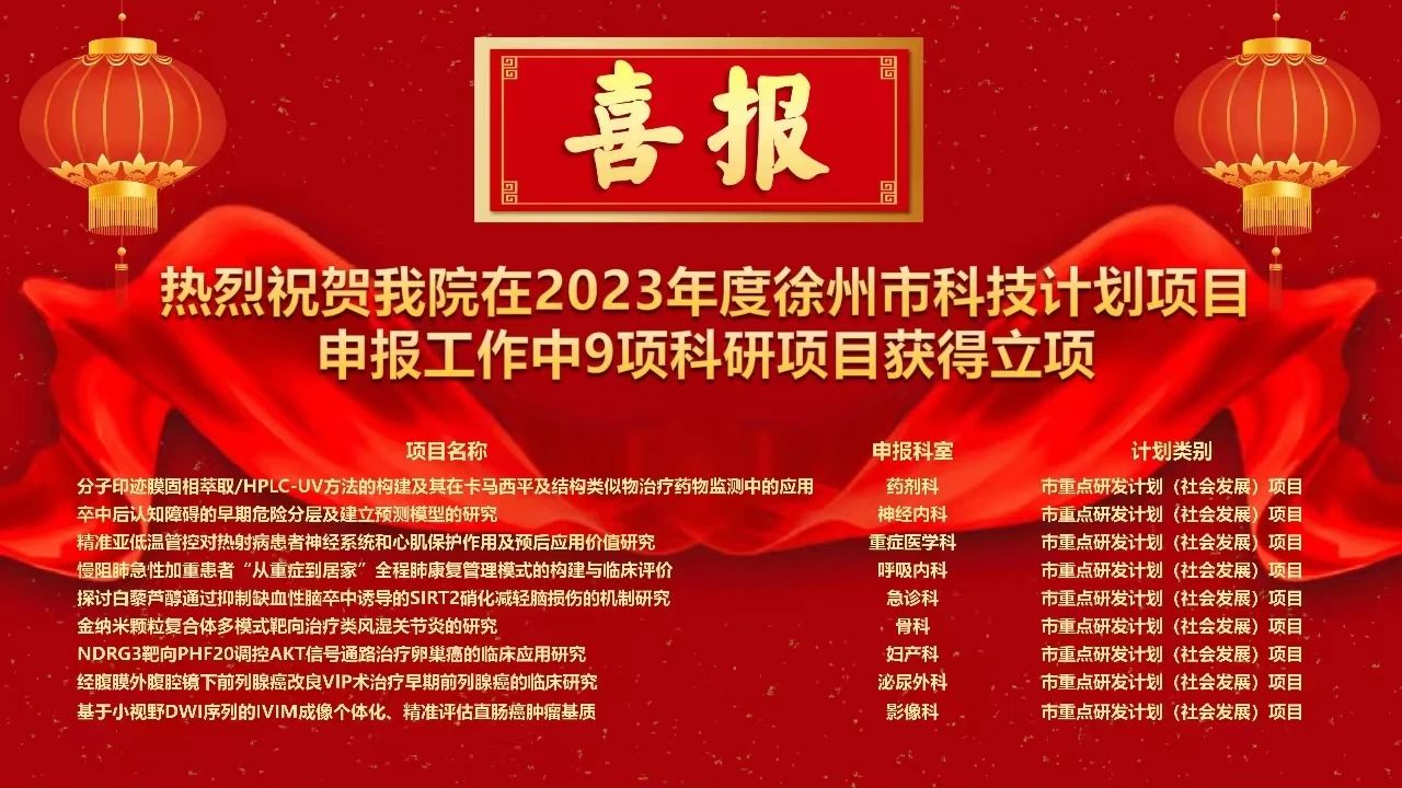 近日,徐州市科学技术局下发《2023年度徐州市推动科技创新专项资金(重点研发计划社会发展及“双碳”专项社会发展示范)拟立项项目公示》,我院共有9个项目获得立项。