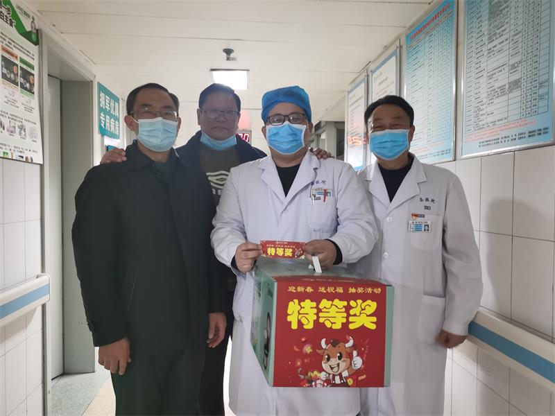 在万家灯火,阖家团圆的除夕之夜,院领导班子成员及相关职能部门负责人慰问看望了节日期间仍坚守在临床一线的全体值班人员,为他们送去了特别的“惊喜”——"牛年的第一份礼物",同时,也送去最亲切的问候与祝福,衷心地祝福他们节日快乐,身体健康,家庭幸福!让坚守在一线岗位上的医务人员切实感受到医院大家庭的温暖与关怀。