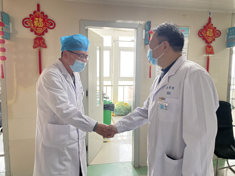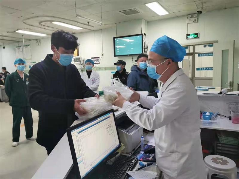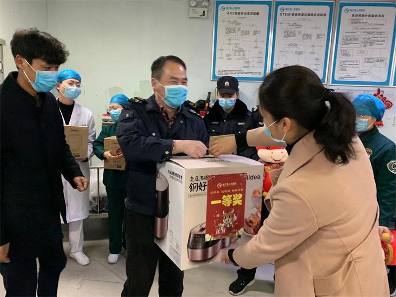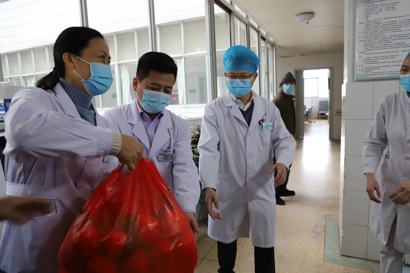 副院长吴豹为值守的临床一线职工送上热腾腾的饺子。