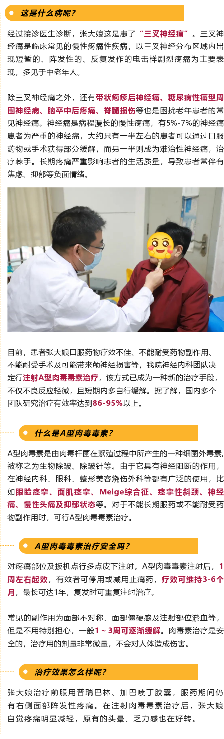 自从发病之后,张大娘就开始了四处奔波就医,口服药的治疗方案换了一种又一种,面部疼痛却没有减轻。经别人介绍,来到了我院神经内科肉毒素治疗门诊。