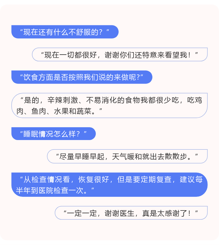 在家访过程中,普外科团队与患者及家属亲切交谈,为患者仔细检查身体,耐心解答疑问,叮嘱患者积极锻炼,按时服药、定期复诊。同时,认真听取患者对改善医疗服务举措的宝贵意见。