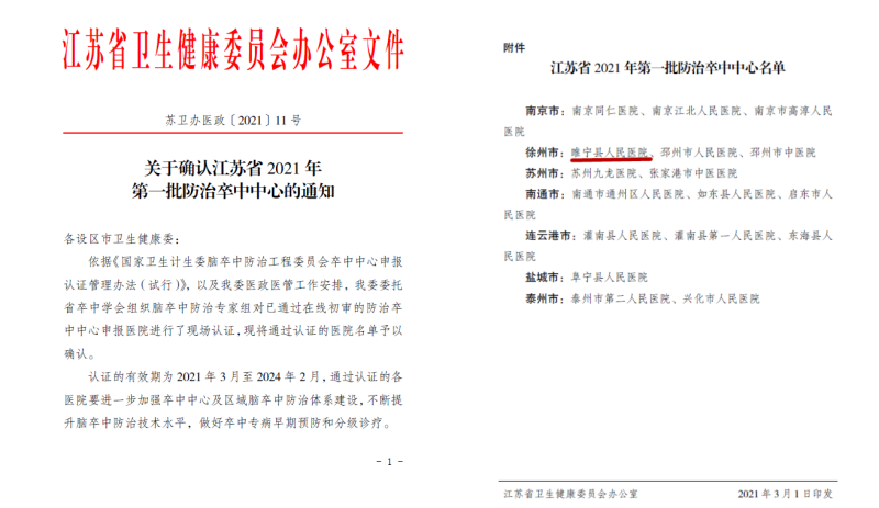 【再传喜报】睢宁县人民医院卒中中心通过江苏省第一批防治卒中中心认证!